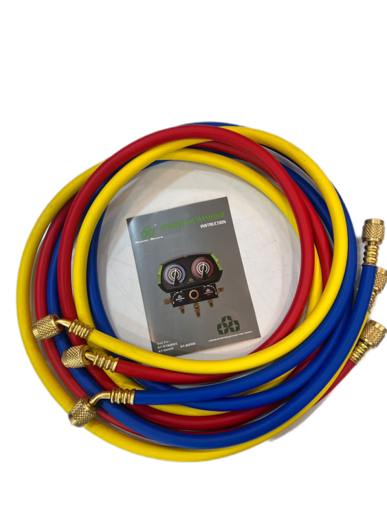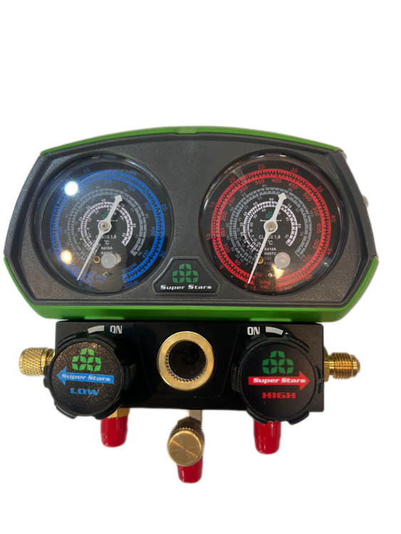 این گیج دوقلو یا منیفولد سرویس دارای یک گیج آبی یا فشار پایین و یک گیج قرمز یا فشار بالا است.